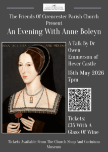 An exciting talk will be presented by our friends, The Friends of the Parish Church about Anne Boleyn on the 15th May at St John the Baptist Parish Church in Cirencester Market Place.
